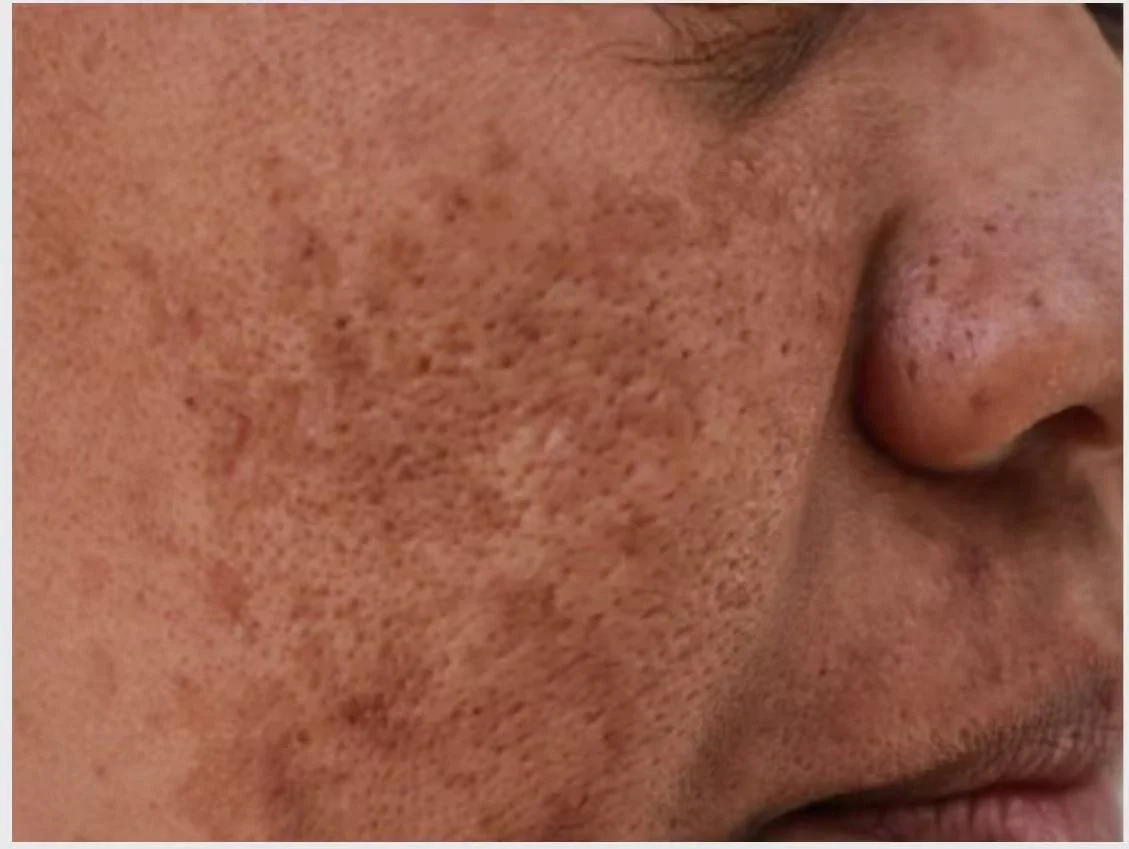 典型位置:多见于两颊,有时会延伸到额头,呈大片咖啡色或猪肝色色块。